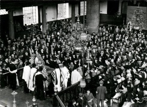 The Esnoga, the famous Portuguese Synagogue of Amsterdam, holding a service for survivors of the Holocaust on May 9, 1945.
